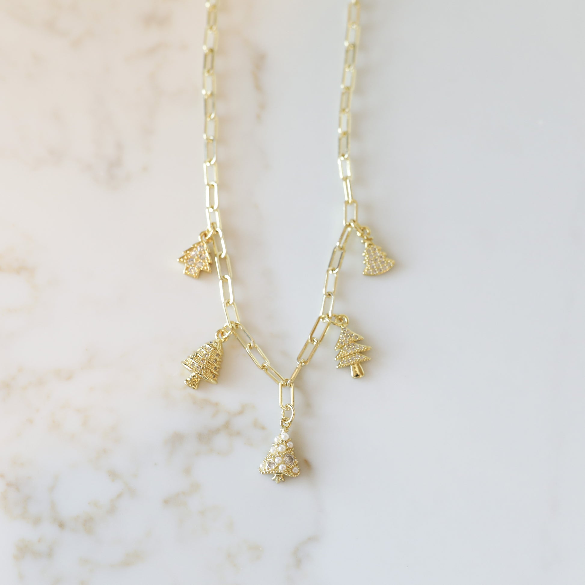 Christmas tree, oh Christmas tree I love how you sparkle from my neck!  Our Christmas Tree Charm necklace will let you don the tree of the season this holiday!  A shiny gold paper clip chain with 5 different style Christmas tree charms placed on it, makes this the perfect necklace for the holiday season!