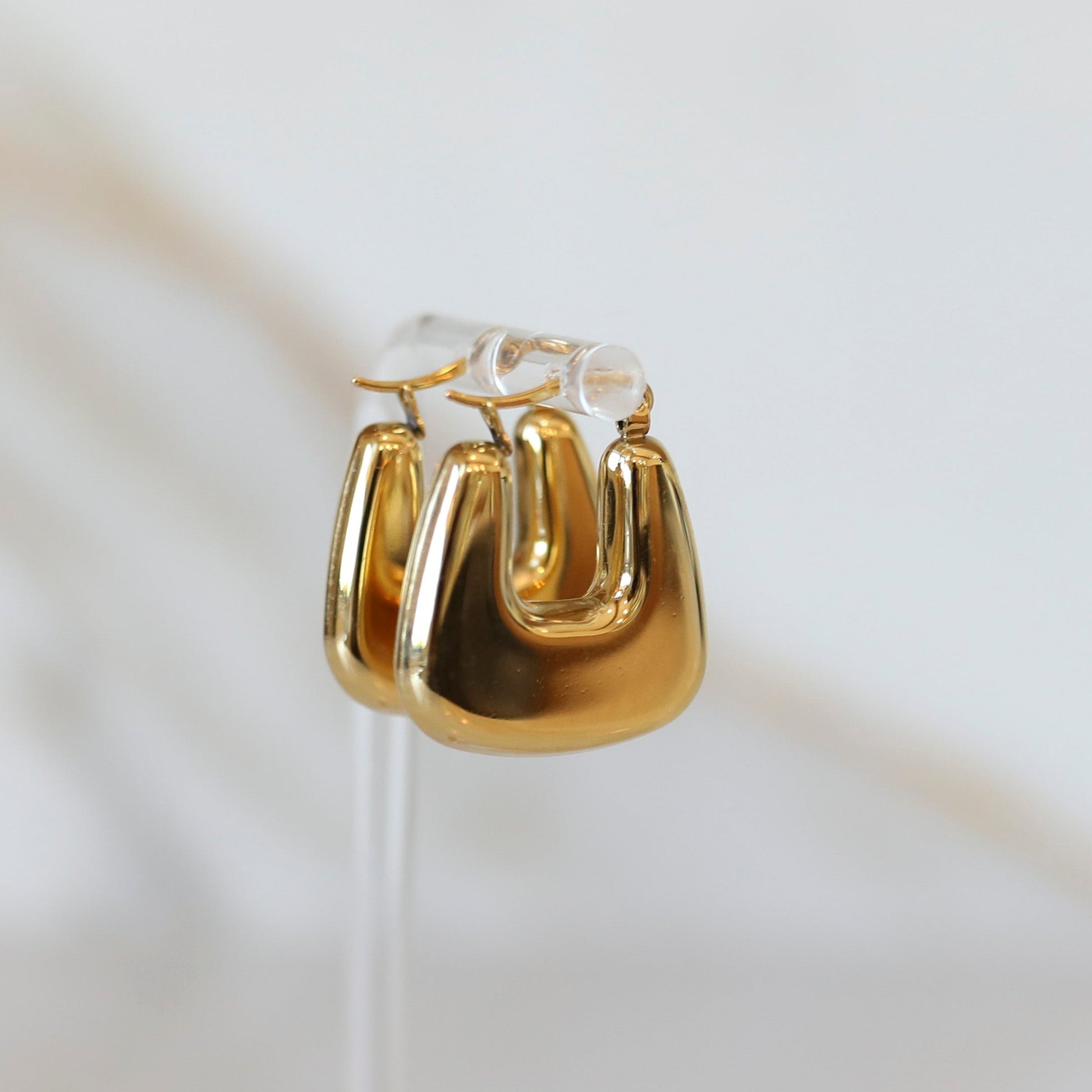 The Retro Chunky Hoop earrings put a groovy twist on a classic.  These shiny gold hoop earrings have a chunky bottom making them the perfect small statement earring.  The easy close snap clasp makes these earrings a quick put on and take off accessory, plus you will know if it securely put in your ear.