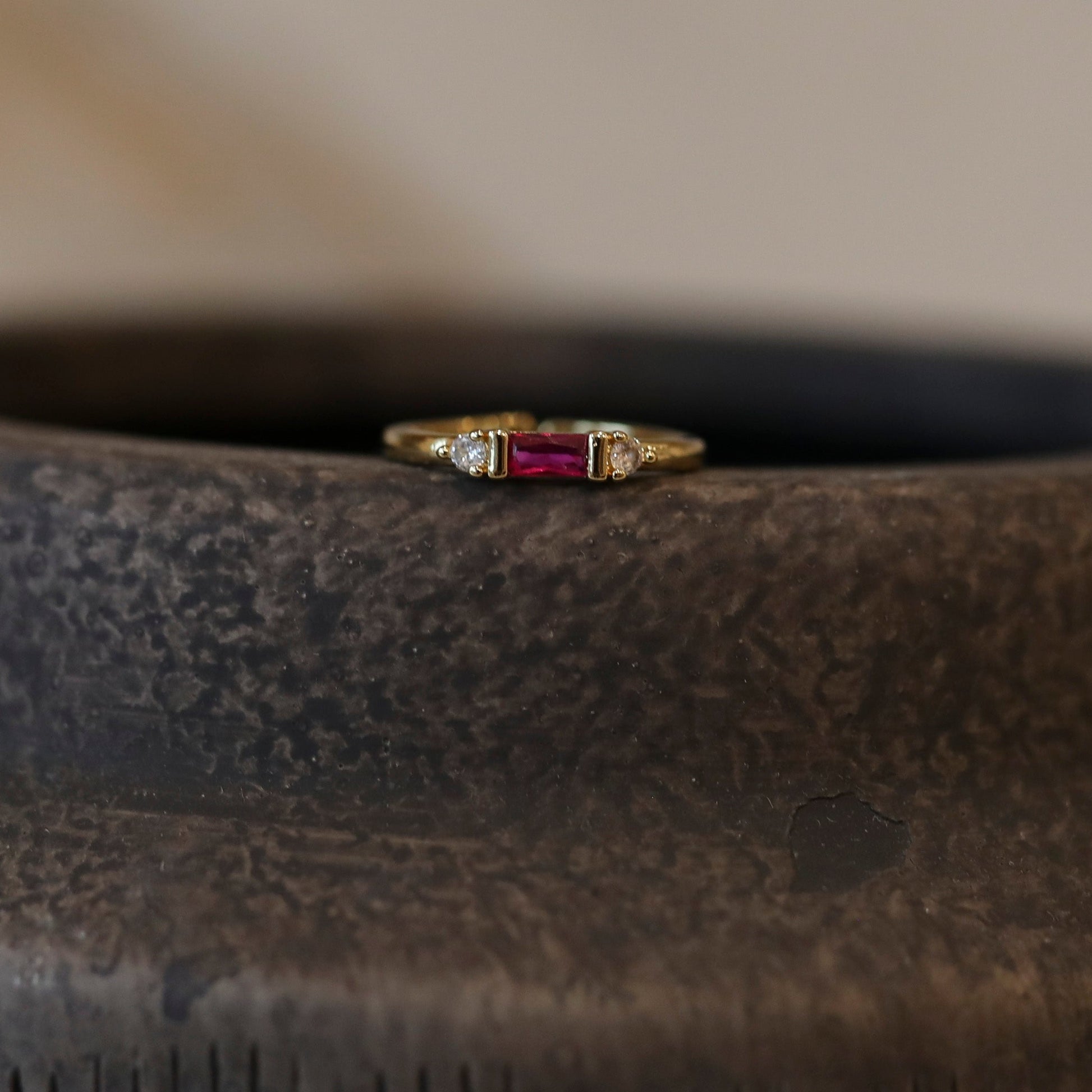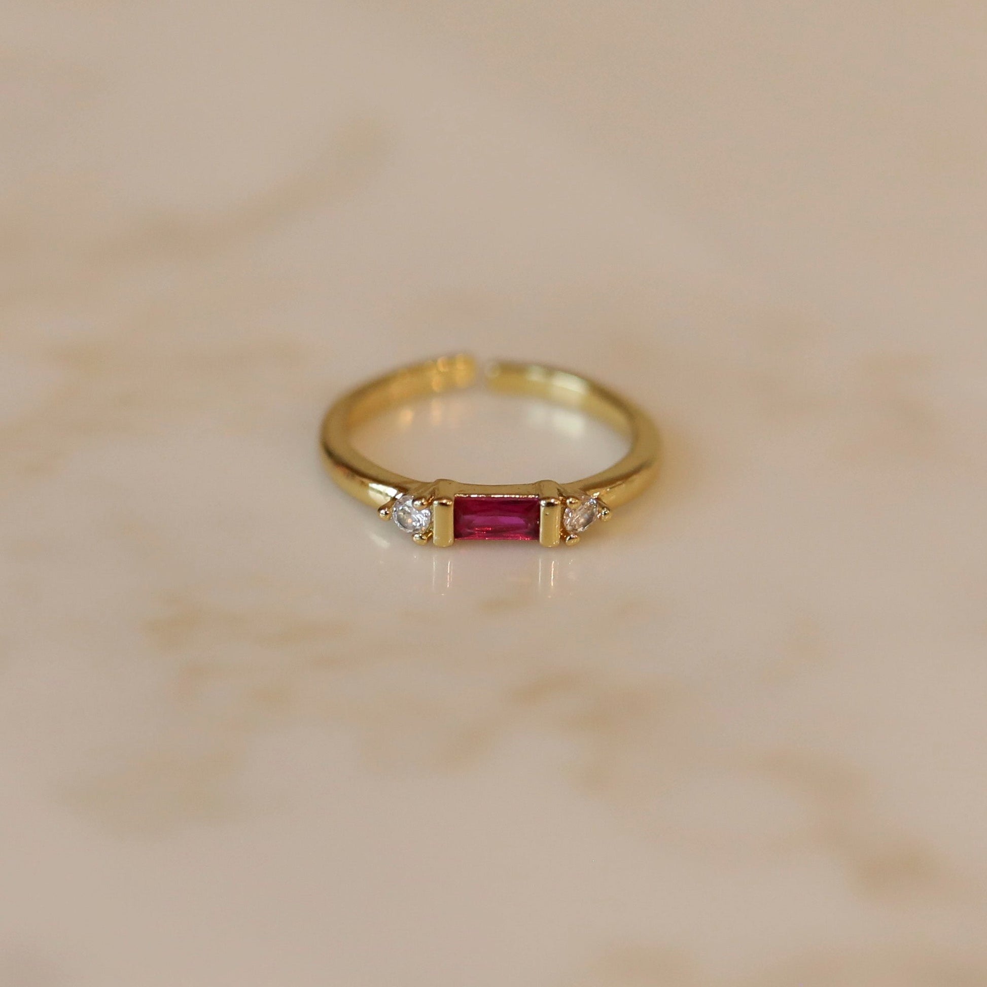 Introducing our Fuchsia Baguette Ring. A must-have for your jewelry collection, this stunning ring features a vibrant fuchsia baguette stone in the middle of cubic zirconia on a sleek gold adjustable band. Make a statement and elevate any outfit with this sophisticated and eye-catching piece.