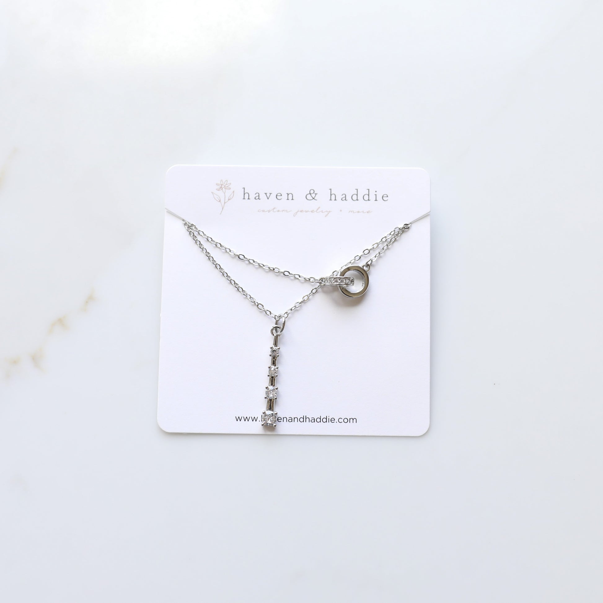 Not sure which necklaces to layer together?  Problem solved with our Layered CZ Necklace!  Two necklaces connected to form one easy necklace that is ready to wear and layer!  The shorter necklace has two circles interlinked while the longer necklace has cubic zirconia gems down a vertical line.  for the perfect pop of bling!