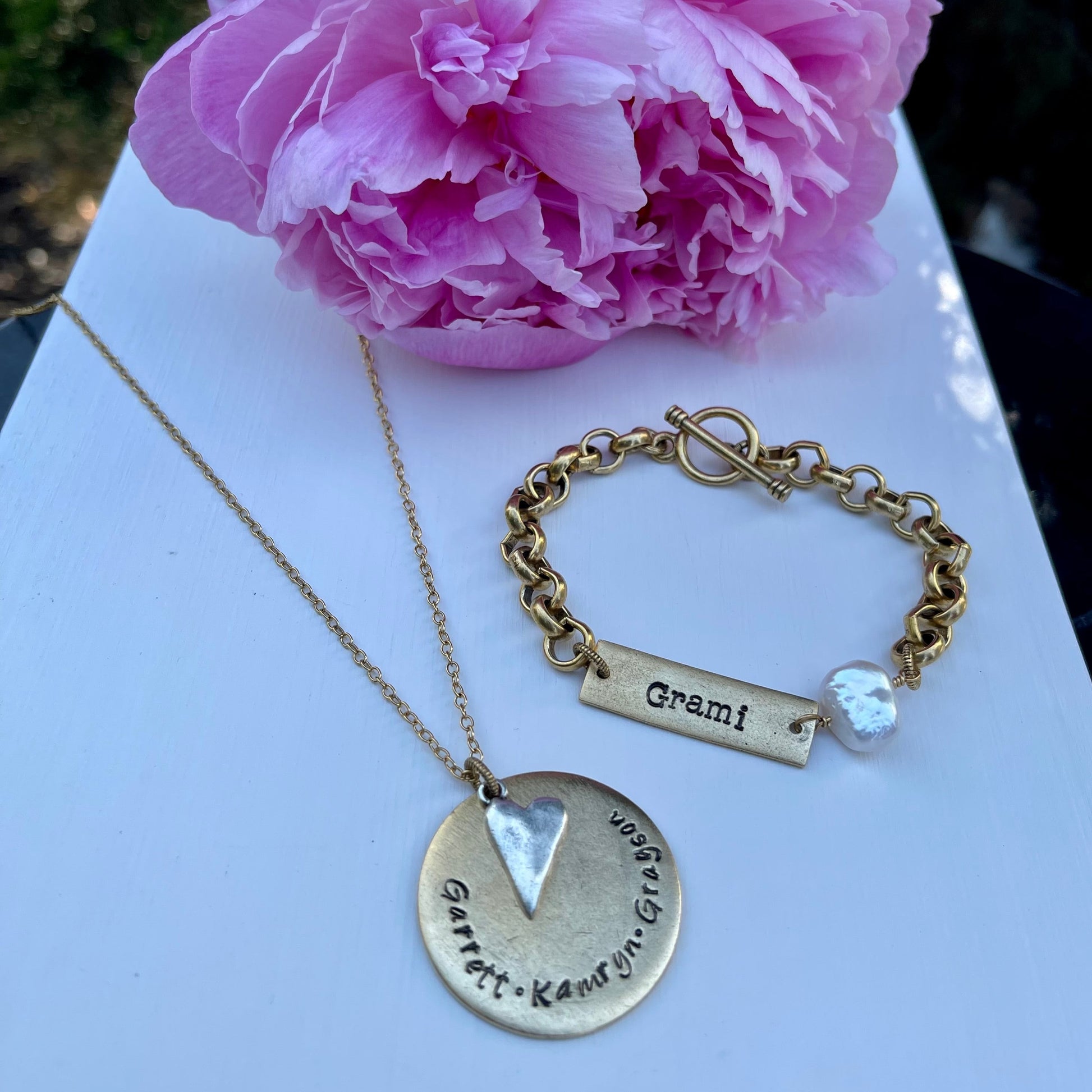 Show your tribe how much you love them when you wear a custom hand stamped necklace in their honor! The names of your closest loved ones, your best friends, your bridal party, or even your precious pets can appear on this personalized necklace. The heart charm symbolizes your love for your people, as an added layer of meaning on this fun piece.