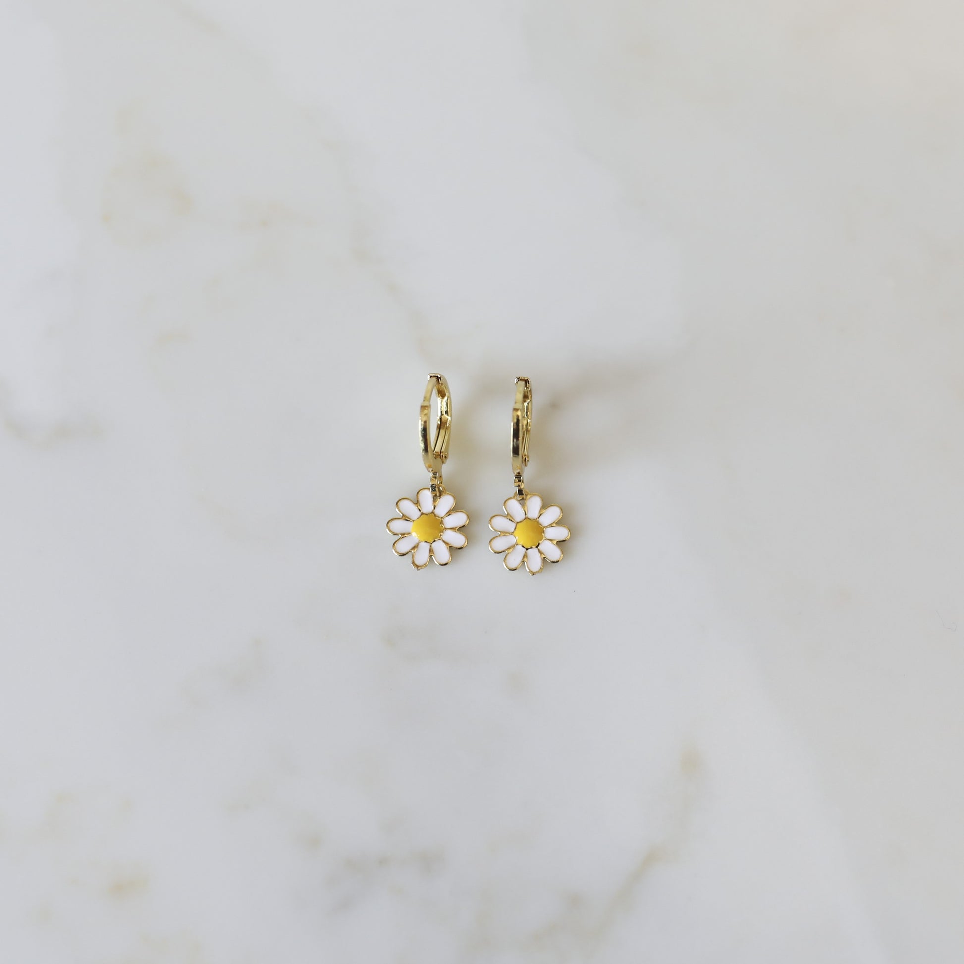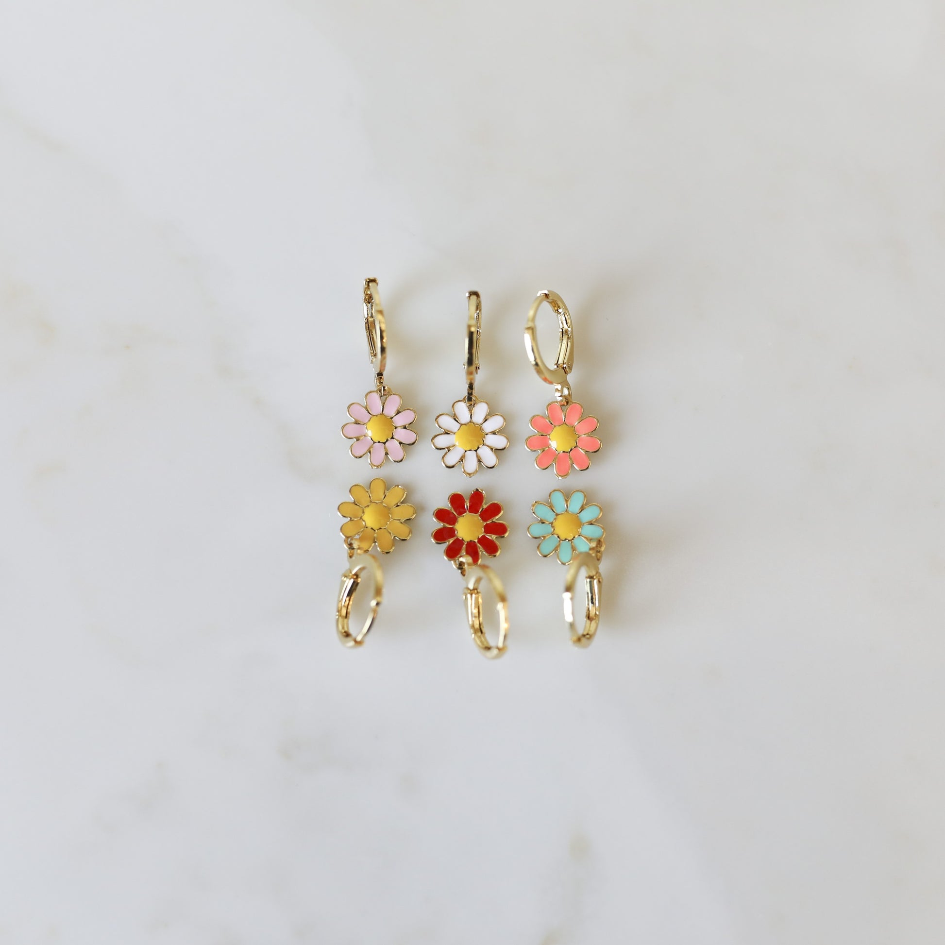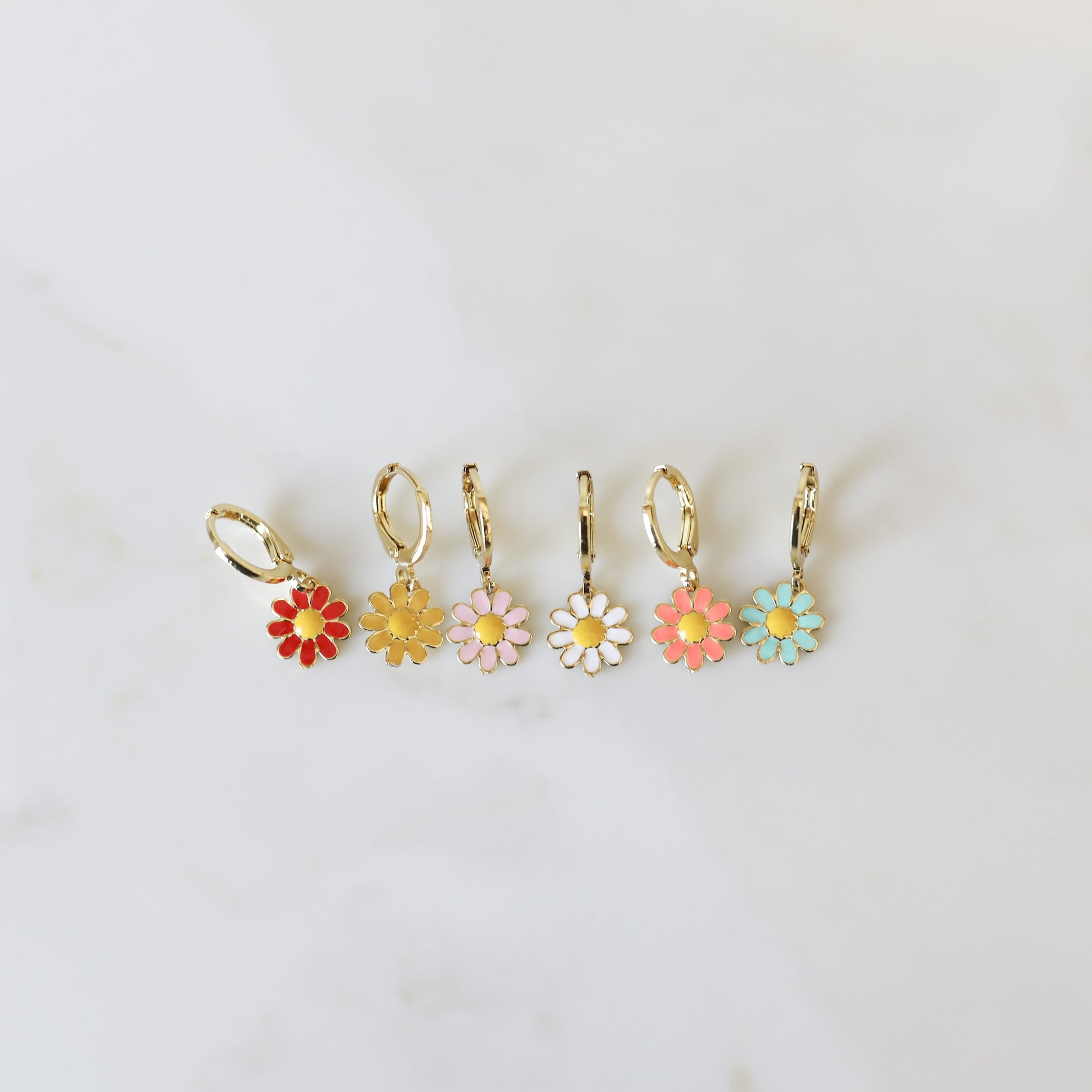 Flower power!  The Mini Daisy Hoop Earrings are the perfect addition to our Daisy Charm Necklace!  And these super lightweight hoops will be the perfect finishing touch to your Fiesta Friday getup!  Cute little daisy enamel charms dangling from a comfortable hoop clasp.