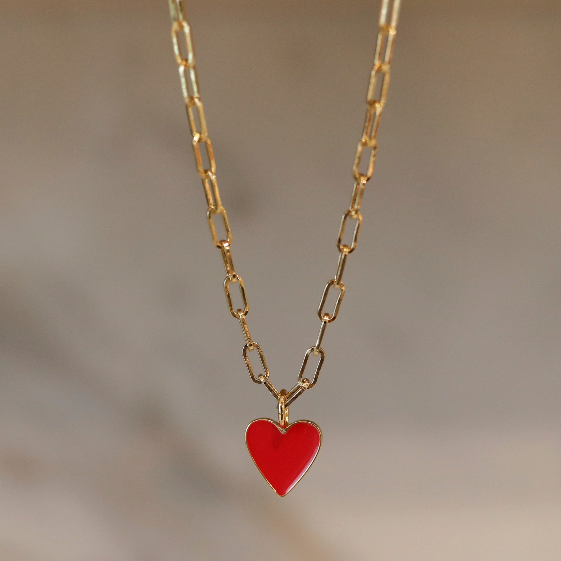 A must have for Valentine's Day! Our Enamel Heart Layering Necklace features a white or red enamel heart on a 18k gold plated paper clip chain! This is the perfect necklace to layer with your other Haven & Haddie necklace or wear it by itself!