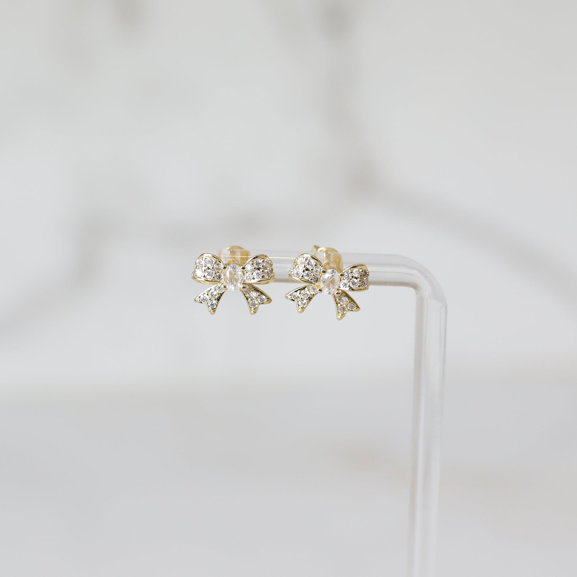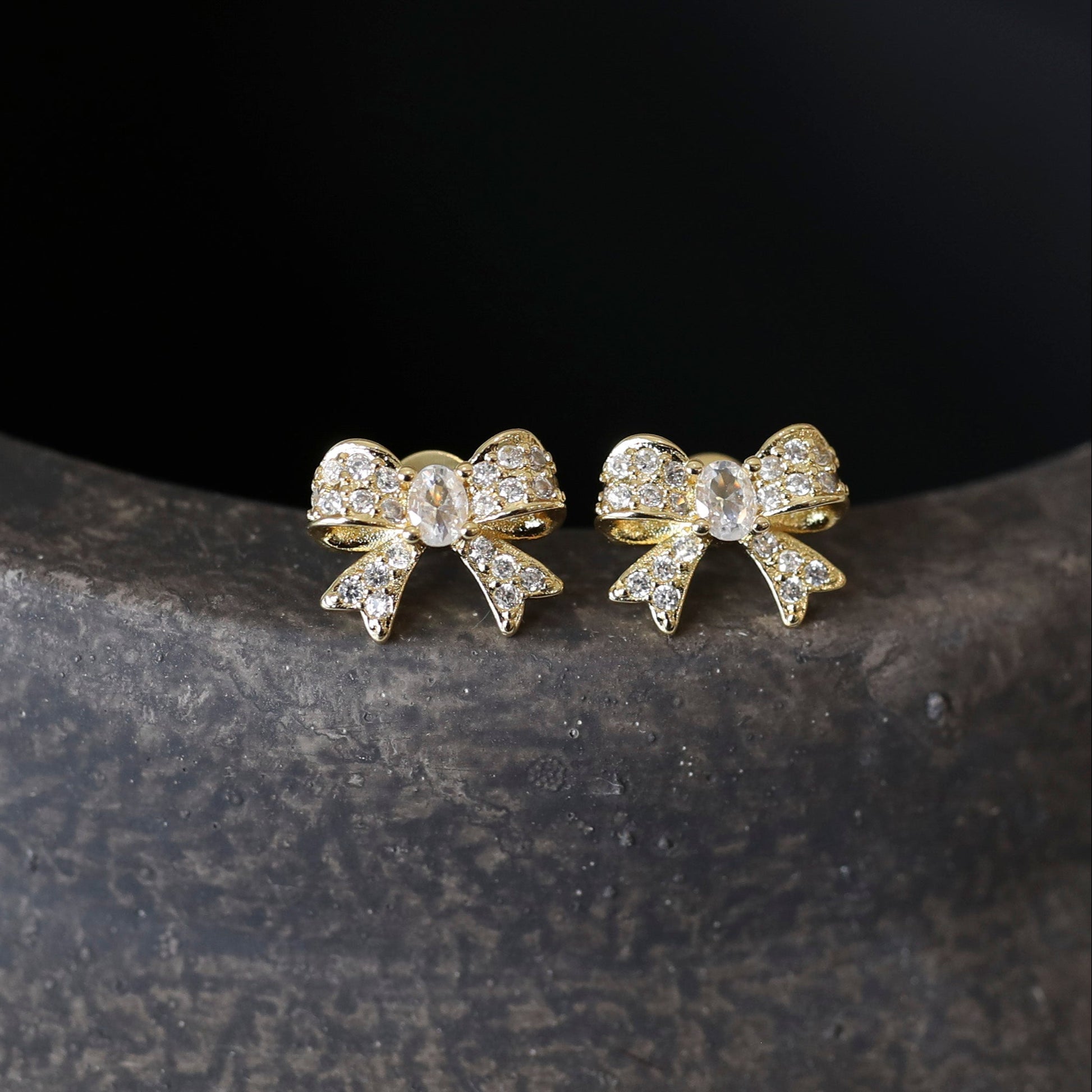 The Puffy Bow Stud earrings are some thick bow shaped studs filled in with cubic zirconia gems.  These gold earrings are sure to add some razzle dazzle to your outfit!  Pair these earrings with a causal outfit to add some extra bling or put some extra sparkle with your little black dress for an evening out!