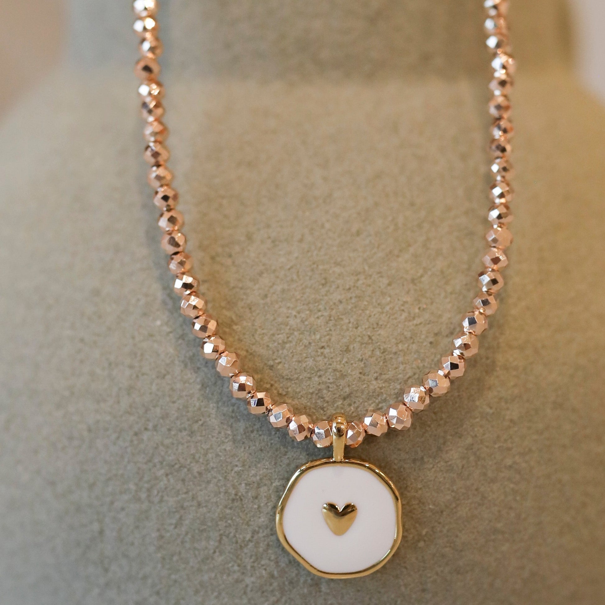 Back to basics with this Rose Gold Heart Necklace! Neutral crystal color with a touch of white and gold on the wax seal pendant, makes the perfect addition to any outfit!